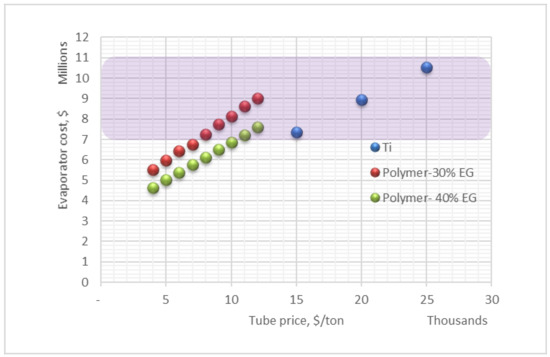 The MED evaporators’ cost based on our prediction prices for the polymer composite tubes is shown in Figure 8. The total cost of the evaporator based on the cost of the fabricated polymer tubes is $5.0 million and $5.7 million for the HDPE–EG 60/40 and HDPE–EG 70/30, respectively. This indicates the use of higher thermal conductivity composite is more economical regardless of the higher price of its tubes compared to lower conductivity composite. These evaporator costs based the HDPE–EG 60/40 and HDPE–EG 70/30, are 52.4% and 45.7% lower than the titanium evaporator when Ti tube price $25,000/ton.