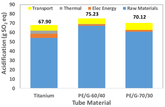 If any process directly or indirectly participates in emitting NH3, NOx, or SO2, it acidifies the environment, a process known as acidification. Moreover, if any process directly or indirectly releases nutrients to freshwater, it enhances algae formation, which is detrimental to the species; this phenomenon is known as freshwater eutrophication. The LCA indicators acidification (AC) and freshwater eutrophication (FE) are measured in terms of equivalent Sulfur dioxide (SO2) and phosphorous (P). Figure 11 and Figure 12 exhibit AC and FE for titanium and polymer tubes. In both cases, polymer tubes cause more AC and FE than titanium tubes. Furthermore, titanium-tube manufacturing has a low impact on FE, due to the lower use of phosphorous-based compounds.