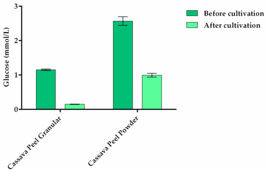 As shown in Figure 1, the composition of glucose from cassava peel hydrolysate was determined by the DNS method. It was evaluated which process would provide more glucose to Stigeoclonium sp. B23 during cultivation. A specific BG-11 culture was selected whose sodium nitrate concentration was 1.5 g/L (100% NaNO3 of BG-11 standard medium) and supplemented with the 1.0 g/L of CPH. One milliliter of BG-11 media before and after cultivation was collected for measurement using a standard glucose curve (Figure S1). The highest concentration of glucose after hydrolysis and before cultivation was obtained with powder cassava peel with 2.56 ± 0.07 mmol/L. Conversely, the maximum glucose concentration of unpulverized granular cassava peel was 1.14 ± 0.01 mmol/L. The glucose amount of powder hydrolysis approximately increased 2-fold more than the non-pulverized granular hydrolysis. However, the consumption of glucose from the hydrolysis of non-pulverized granular was higher with 86.45% and the powdered cassava peel was 61.33%. This can be explained by the fact that acid hydrolysis can improve the porosity of the substrate by using cellulose and hemicellulose, making the substrates more available for enzymes as well as increasing the anaerobic digestion process and subsequent metabolization of sugars by photosynthetic microorganisms such as microalgae and cyanobacteria [45].