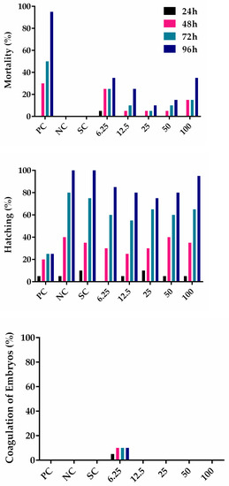 Fish Embryo Acute Toxicity (FET) Test was conducted in accordance with OECD guideline 236 to analyze the toxicity of PHB nanoparticles on fertilized zebrafish embryos [44]. Twenty embryos per experimental group (one embryo per well) were exposed to five PHB nanoparticles concentrations (6.25, 12.5, 25, 50, and 100 µg/mL) in a 24-well plate for 96 h. 3,4-dichloroaniline (4 mg/L) was used as positive control, and negative (egg water) and solvent control (acetone 0.1%) were included. Four important toxicity parameters were observed every 24 h in the stereomicroscope (Olympus, SZX10, Hamburg, Germany): (a) coagulation of fertilized eggs, (b) lack of somite formation, (c) lack of detachment of the tail-bud from the yolk sac, and (d) lack of heartbeat. At the end of the test, acute toxicity was evaluated using the results obtained in any of the four observed parameters. The approval by an Ethics Committee was not necessary as the chosen procedures were not considered animal experimentation according to the EC Directive 86/609/EEC for animal experiments.