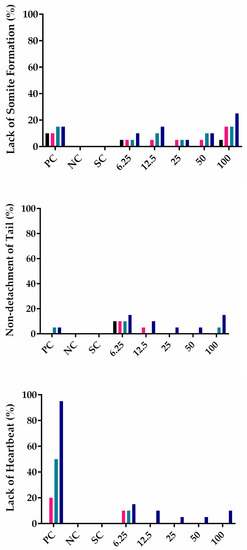 Results from fish embryo acute toxicity test (FET). Cumulative results in percentages are given for mortality, coagulation of embryos, lack of somite formation, hatching, non-detachment of tail, and lack of heartbeat. Data represent 20 embryos per group (1 embryo/well) exposed for 24 h, 48 h, 72 h, and 96 h. PC positive control, NC negative control, SC solvent control, and concentrations of PHB nanoparticles (6.25–100 µg/mL). The experiment was conducted once.