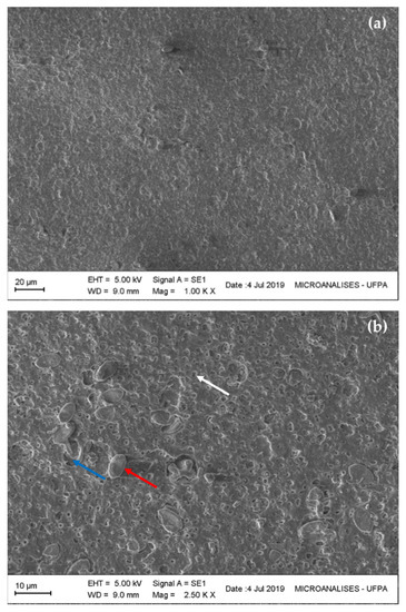 The PHB samples were previously freeze-dried to eliminate liquid traces and subsequently metallized with gold for 1.5 min (approx. 15 nm) using Emitech K550X (Montigny-le-Bretonneux, France). The morphology and fractured surfaces of PHB were evaluated using a Zeiss EVO-MA-10 SEM (Oberkochen, Germany) equipment. The operating conditions were: electron beam current = 100 µA, constant acceleration voltage = 1.5 and 5 kV, and working distance = 9 to 10 mm.