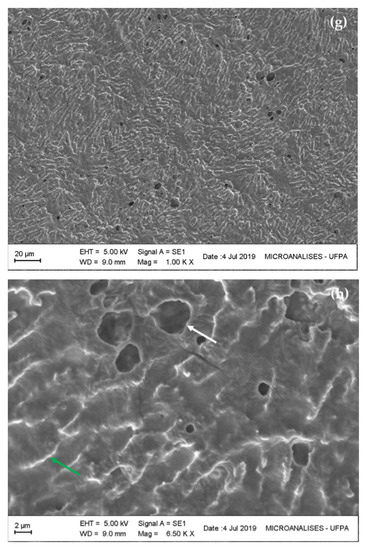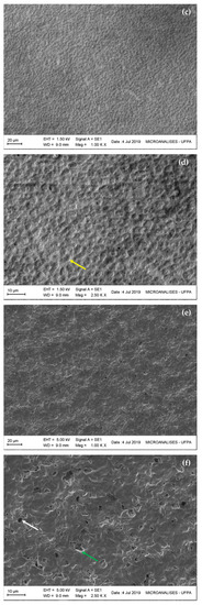 Figure 3 shows SEM images of characteristic regions of fractured surface and morphologies of PHB by Stigeoclonium sp. B23. PHB was extracted by modifying the microalga cultivation. The PHB surface is naturally brittle, hard, rough, and highly porous due to its crystallinity structure and more ductile fracture behavior [60,61]. Extracted PHB from BG-11 with no sodium nitrate showed a non-rigid, scaly, soft, and easily breakable surface, with non-attached grains and the formation of empty and brittle small pores with different sizes, possibly caused by the non-addition of carbon that could reinforce the polymer, indicating a small open-pore matrix (Figure 3a,b). This development is possibly linked to the initial process of biodegradation, which decreases the quality of PHB, but it improves the flow and metabolization of the polymer [49]. Therefore, degradation of the polymer in the human body through surface erosion makes PHB more suitable and, consequently, can be employed in several applications such as nerve repair implants and as support material for bone inserts [14].