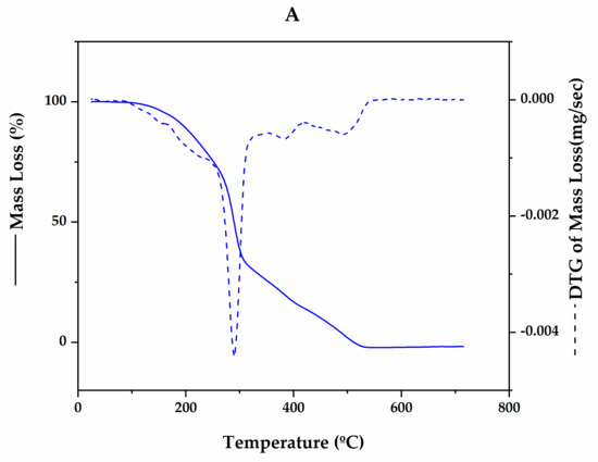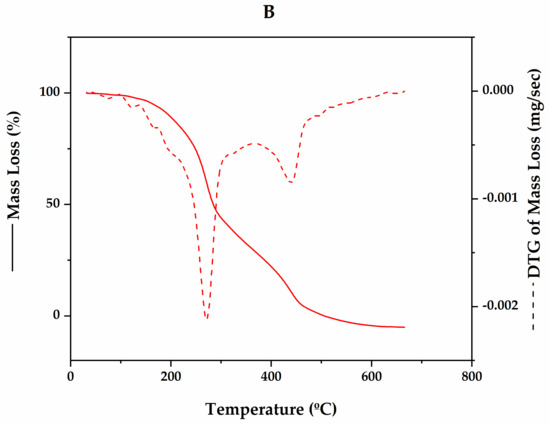 Figure 5 shows the associated thermogravimetric and derivative thermogravimetric curves of PHB samples. TGA and dTGA curves showed that the two PHB samples tested underwent more than one thermal event due to the presence of impurities and additives during the polymer extraction process. Thermal degradation of PHB is determined by a random chain break reaction of PHB ester groups to form shorter chains with carboxylic and olefinic terminal groups [35]. In the PHB extracted from the microalga grown in BG-110 (Figure 5A), the initial decomposition temperature (Tonset) of PHB was 252.90 °C and 225.58 °C in the medium enriched with CPH (Figure 5B). This result shows that the PHB obtained can be thermally stable at temperatures below 220 °C (Table 3). Additionally, thermal degradation was determined during weight loss, in which the losses were 1.467 mg (71.56%) for BG-110 and 1.038 mg (69.99%) for the culture enriched with CPH. These data indicate the presence of impurities or additives remaining from the PHB extraction process [72]. The degradation temperature (Td) peaks for the biopolymer from BG-110 and Cultivation 1 were at 271.72 °C and 254.20 °C obtained by TGA and dTGA curves, which are relatively similarly obtained from DSC curves (Figure 4). The thermal degradation around 300 °C is mostly related with the ester cleavage of PHB by β-elimination reaction [70]. The presence of two new thermal degradation events was also observed due to the presence of impurities and additives previously cited in BG-110 with Tonset at 377.15 °C and 454.03 °C and one new thermal degradation event in PHB extracted CPH cultivation with Tonset at 413.58 °C. The thermal degradation results of the microalgal PHB are similar to the thermal properties of the commercial PHB obtained by Lee et al. 2002, [73]. To make the PHB matrix thermally more resistant, it is necessary to reinforce it with subunits of 3HV and 4HB, resulting in a material with good properties and potentially can be applied in a range of biotechnological applications [74]. Thus, the results presented suggest that the PHB obtained from the Amazonian microalga Stigeoclonium sp. B23 produces a higher percentage of pure biopolymer of PHB and can potentially be used in several areas of current biotechnology, such as in the manufacture of biodegradable biomaterials.