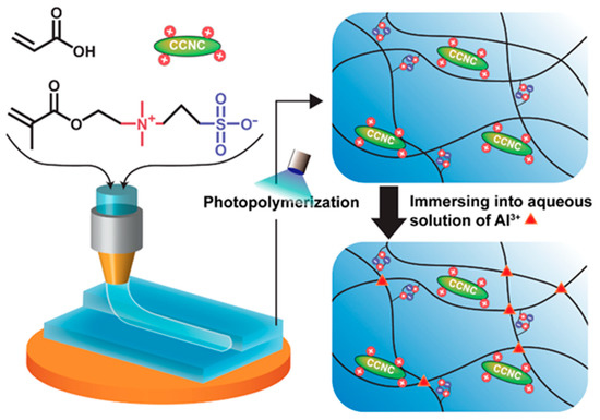 Our previous work [39] used unmodified CNCs to prepare ink for 3D-printable strain sensors. Although we achieved gels with high mechanical strength and stretchability, the materials were not transparent due to the high particle loading. To address this challenge, we investigated the 3D printing of zwitterionic nanocomposite hydrogels with modified CNCs. Our design used cationic cellulose nanocrystals (CCNCs) for DIW, as shown in Figure 1. The ink was composed of CCNCs, acrylic acid (AA), and 3-dimethyl (methacryloyloxyethyl) ammonium propane sulfonate (DMAPS). After printing, the zwitterionic nanocomposite hydrogels with multiple physical cross-links were formed by the photo-initiated polymerization of AA/DMAPS, and the introduction of Al3+ ions. Although some previous studies have attempted to use CCNCs for nanocomposite hydrogels, the potential of using such CCNC-based hydrogels for 3D printing and wearable sensors has not been explored yet [40,41]. We found that CCNCs had a stronger tendency to form physical networks than conventional CNCs. Therefore, the nanocomposite hydrogels of CCNCs could be printed with a low concentration of fillers to achieve high transparency but still demonstrated good mechanical strength. Finally, we assembled the CCNC-reinforced zwitterionic nanocomposite hydrogels as a capacitive sensor capable of monitoring different mechanical deformations. We demonstrated that DIW could print hydrogels with a grooved surface to enhance the sensitivity of tactile sensors.