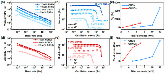 We then compared the rheological behavior of the ink with native CNCs and CCNCs. The inks were prepared by dispersing different concentrations of nanocrystals in the aqueous solution of AA and DMAPS. As indicated in Figure 2a,d, the inks of both CNCs and CCNCs showed shear-thinning behavior. When the shear rate increased from 0.1 to 100 1/s, the viscosity of the ink containing 7 wt.% CCNCs decreased significantly from 2515 Pa∙s to 1.8 Pa∙s. Notably, the inks with CCNCs were more viscous than the ones prepared from CNCs. Under the same filler content (7 wt.%), the viscosity of the CCNC ink at 0.1 1/s was 15 times higher than that of the CNCs. At least 12 wt.% CNCs was needed to achieve the viscosity of the 7 wt.% CCNC ink. We also attempted to use the power-law model to analyze the shear-thinning behavior of the inks for 3D printing (Table S2) [44,45]. The flow indexes (n) of both inks were less than 1 at low filler contents. Similar to the previous studies of concentrated CNCs suspension, the flow indexes of CNC and CCNC inks were close to zero, indicating the formation of yield stress fluids [46].