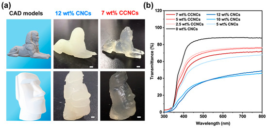 Optical properties and the 3D printed models with different nanocrystal inks. (a) 3D printed sphinx and Moai statue. The first column shows the CAD models. The second and third columns show the hydrogels using 12 wt.% CNCs and 7 wt.% CCNCs, respectively. The nozzle diameter was 0.4 mm. The scale bars correspond to 1 cm. (b) Transmittance spectra of the printed hydrogel film using various concentrations of CNCs or CCNCs.