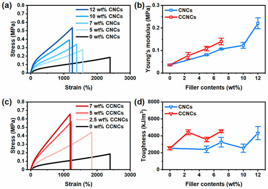Mechanical properties of the nanocomposite hydrogels. (a) Tensile stress–strain curves of the hydrogels with different concentrations of CNCs. (b) The effect of different nanocrystals on the Young’s moduli of the nanocomposite hydrogels, CNCs (blue) and CCNCs (red). (c) Tensile stress–strain curves of the hydrogels with different concentrations of CCNCs. (d) The effect of different nanocrystals on the toughness of the nanocomposite hydrogels, CNCs (blue) and CCNCs (red).