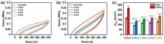 Furthermore, the nanocomposite hydrogels showed partial self-recovery as each loading curve overlapped with the previous unloading curve. We thus analyzed the time required for self-recovery. The printable hydrogels of CNCs and CCNCs were stretched to 300% strain, unloaded, and loaded again after different waiting times (Figure 6). As discussed earlier, the CCNC nanocomposite hydrogels had higher Uhys than the CNCs hydrogels. Both hydrogels were significantly softened after the first cycle. Only around 50% of Uhys could be recovered if the hydrogels were immediately loaded again. After resting for 1 min, 2 min, and 5 min, both hydrogels could progressively recover to at least 70% of their initial Uhys. Although the CNCs hydrogels recovered to 79.3% of their initial value, higher than the CCNCs hydrogels (70.0%), more energy was required to break the stiff CCNC network. The magnitudes of Uhys recovered by the CNCs or CCNCs at a given resting time were similar. Neither hydrogel could fully recover because of the permanent fracture of CNC or CCNC networks. Nevertheless, the above results indicate that the nanocomposite hydrogels could partially recover to their initial strengths and that the surface functionalization of the nanocrystals had no significant effect on the recovery rate. In addition, the previously reported nanocomposite hydrogels using CCNCs typically had a slow recovery rate and needed more than 1 h of resting time to achieve 70% of their original Uhys after each cycle [40,41]. Therefore, our CCNC nanocomposite hydrogels showed enhanced fatigue resistance, potentially due to the fast rearrangement of the polymer network.