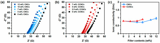 We performed electrochemical impedance spectroscopy (EIS) to survey the effects of different nanocrystals on the ionic conductivity of the nanocomposite hydrogels. In Figure 7a,b, the hydrogels made by CNCs or CCNCs showed similar trends in the Nyquist plots under various filler contents. The hydrogels with 7 wt.% CCNCs had a bulk resistance of 29 Ω and high ionic conductivity of 0.9 S/m. As summarized in Figure 7c, both types of hydrogels had high ionic conductivity even at relatively high filler contents (7 wt.% for CCNCs and 12 wt.% for CNCs). The concentration of fillers had a minimal effect on the ionic conductivity of our hydrogels. The ionic conductivity of the CCNC hydrogel was slightly higher than that of the CNC hydrogel, possibly because of additional counter ions introduced by the surface modification. Our previous work using deep eutectic solvents with unmodified CNCs showed a significant decrease in ionic conductivity when adding more nanocrystals [39]. However, a much larger amount of non-conductive CNCs was needed to form strong physical networks in the deep eutectic solvents. The high viscosity of the solvent may also have inhibited the movement of ions through the gels. The good ionic conductivity of the nanocomposite hydrogels indicates their potential as wearable sensors.