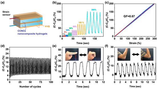 To further demonstrate the potential of this sensor, we mounted the sensor on a volunteer’s finger and elbow. As shown in Figure 8e,f, the sensor exhibited reproducible responses for both large and small movements of the human body, such as bending the elbow or finger. The above results demonstrate that the printed CCNC nanocomposite hydrogels can successfully act as stretchable ionic conductors for a capacitive strain sensor.