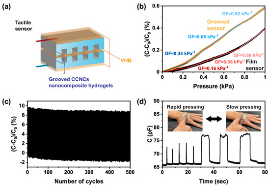Finally, we used DIW to increase the sensitivity of tactile sensors. As well as their use as strain sensors, capacitive devices are commonly used as tactile sensors that detect pressure changes upon touching or pressing. The sensitivity of the tactile sensors depends on the change of contact area between the hydrogels and the dielectrics. For simple parallel-plate geometry, the sensitivity comes from the intrinsic compressibility of the hydrogels and the dielectrics. Several recent studies [57,58] have used hydrogels with structured surfaces to enhance the compressibility and the sensitivity of the tactile sensors. Here, we printed grooved hydrogels (Figure 9a) for the tactile sensors. Owing to the high yield stress of the CCNC ink, we were able to construct a series of grooves between the contact of the hydrogels and the dielectrics. The depth of each groove was 800 μm and the line-to-line spacing was 400 μm. The detailed designs can be found in Figure S10. The grooved hydrogels were more deformable than simple thin films. As shown in Figure 9b, the grooved sensor had higher gauge factors than the film sensor, especially when only small pressure (<0.2 kPa) was applied. The sensitivity of our device was comparable to previous work [57,58] with structured hydrogels (0.45 kPa−1 to 0.84 kPa−1). The grooved sensors also had a stable response over 500 cycles of pressing and releasing (Figure 9c). When the grooved sensor was mounted on a volunteer’s hand, it could detect both rapid and slow pressure changes upon pressing (Figure 9d). The above studies show that our CCNC nanocomposite ink has great potential for use in wearable sensors. 3D printing allows a facile design and fabrication for sensors with enhanced sensitivity.