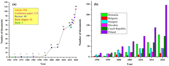 The number of documents versus year published by Romanian researchers (a) and researchers from different Central and Eastern European countries (b), according to the Scopus database using the keyword “cellulose”.
