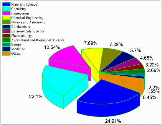 Subject area classification of the scientific production made by Romanian researchers in the period 1965–2020, organized by fields according to the Scopus database using the keyword “cellulose”.