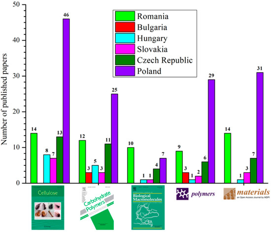 In order to quantify the impact of the scientific papers published by the authors with affiliation in Romania, the author conducted a study using as a basis the years of publications appearing in the period 2015–2020, indexed in the Scopus database. Thus, the first five journals (to be classified in Q1 and Q2 according to Clarivate Analytics Web of ScienceTM Journal Citation Report, Philadelphia, PA, US, representative for the “cellulose” research field) in which most articles were published were retained. The following journal titles were identified: Cellulose, Carbohydrate Polymers, International Journal of Biological Macromolecules, Polymers and Materials. Then, these journals were also checked for researchers with affiliation in other Central and Eastern European countries, the results being depicted in Figure 3. Interestingly, the percentage of articles published in the five selected journals as compared to the total number of documents published in the mentioned period is almost the same for the authors affiliated in Hungary, Czech Republic and Slovakia, around 8%, lower for authors affiliated in Bulgaria (about 6%), while Poland and Romania are in the top position with about 12.5% publications.