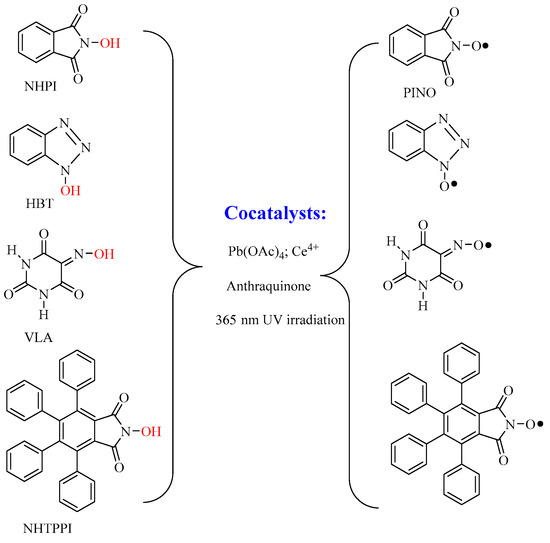 The oxidation reaction of cellulose has been extensively studied and well documented within the “Petru Poni” Institute of Macromolecular Chemistry in Iasi in the department led by Sergiu Coseri. Since 2009, they have reported for the first time a new protocol for the selective oxidation of primary alcohol groups in the anhydroglycoside unit of cellulose, using nonpersistent nitroxyl radicals as reaction mediators generated in the reaction medium, in combination with diluted solutions of sodium hypochlorite and sodium bromide at pH = 10 and room temperature [26]. The nitroxyl radical used as a mediator, phthalimide-N-oxy (PINO), was obtained by homolytic cleavage of the >N-O-H bond from N-hydroxyphthalimide (NHPI), see Figure 6. The cleavage of the O-H bond from PINO was possible due to including in the reaction a so called cocatalyst, which promotes the catalytic cycle, and usually contains salts of transition metal salts, anthraquinone, but also UV irradiation at 365 nm.