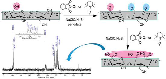 - Coseri, S.; Biliuta, G.; Simionescu, B.C. Selective oxidation of cellulose, mediated by N-hydroxyphthalimide, under metal-free environment. Polym. Chem. 2018, 9, 961–967. [Google Scholar] [CrossRef]