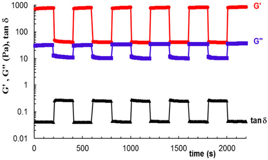 Oscillatory shear measurements were performed to detect the self-healing ability of the hydrogels. G′, G″ values and tan δ behaviour of the hydrogel sample incorporating 10% tricarboxy cellulose in PVA subjected to consecutive low and high strain deformations are shown in Figure 10, highlighting the self-healing capacity of this kind of hydrogels. The destruction of the sample after exposure at a high shear strain followed by its fast recovery can be explained by taking into account the existence of a highly dynamic network in a permanent equilibrium due to physical interactions. By very quickly restoring the structure of the hydrogel as soon as the external force is removed, the hydrogels return to their original structure and functionality, proving undoubtedly their self-healing character [51].