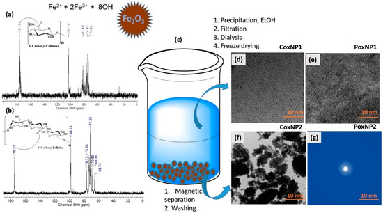 The in situ use of the carboxylated polysaccharides (cellulose or pullulan) to prepare Fe3O4 nanoparticles surrounded by polysaccharide matrix: the 13C-NMR spectra of 6-carboxy cellulose, emphasizing the COOH peak at 176.15 ppm, (a); the 13C-NMR spectra of 6-carboxy pullulan, emphasizing the COOH peak at 175.27 ppm, (b); schematic representation of the Fe3O4 nanoparticles preparation, (c); TEM images of the nanoparticles obtained upon precipitation of the carboxylated polysaccharides (d,e); and magnetic separation (f,g). Reprinted with permission from Ref. [58]. Copyright 2017, Wiley.