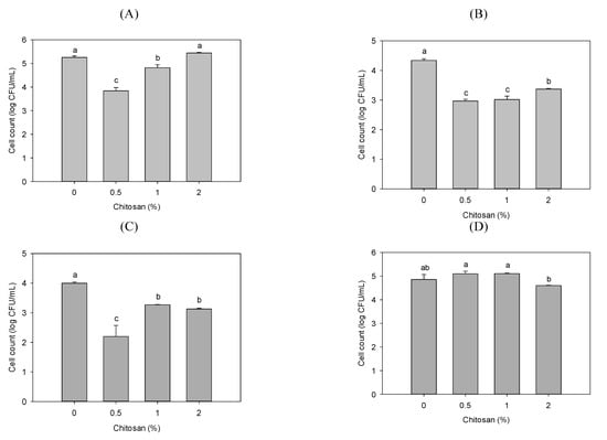 Antibacterial activity of various films of PLA, and PLA containing 0.5%, 1%, and 2% of chitosan against: (A) Escherichia coli; (B) Staphylococcus aureus; (C) Pseudomonas fluorescens; and (D) Vibrio parahaemolyticus. Data are presented as mean ± SD (n = 3). Bars with different letters on top are significantly different (p < 0.05).