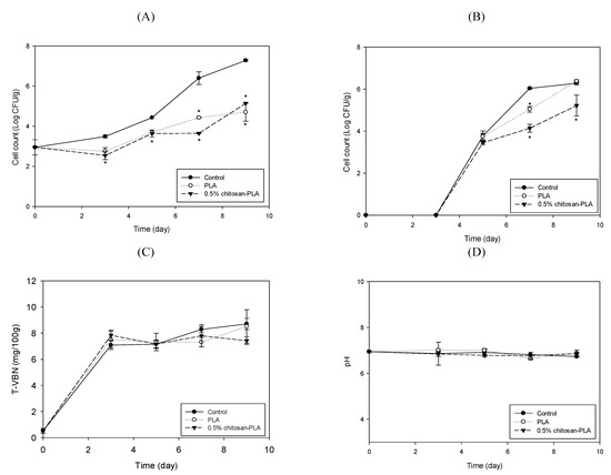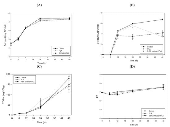Changes in mesophilic count (A); psychrotrophic count (B); total volatile basic nitrogen content (C); and pH value (D) of fish fillet (Epinephelus fuscoguttatus x Epinephelus lanceolatus) uncovered (control) or covered with PLA or 0.5% CH–PLA films during storage at 4 °C. Data are presented as mean ± SD (n = 3). * significantly different compared to control (p < 0.05).