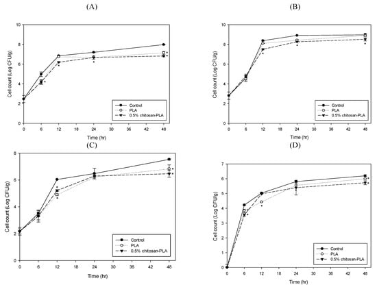Changes in cell counts of coliforms (A); Aeromonas (B); Pseudomonas (C); and Vibrio (D) groups in fish fillet (Epinephelus fuscoguttatus x Epinephelus lanceolatus) uncovered (control) or covered with PLA or 0.5% CH–PLA film during storage at 25 °C. Data are presented as mean ± SD (n = 3). * significantly different compared to control (p < 0.05).