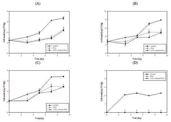 Changes in cell counts of coliforms (A); Aeromonas (B); Pseudomonas (C); and Vibrio (D) groups of fish fillet (Epinephelus fuscoguttatus x Epinephelus lanceolatus) uncovered (control) or covered with PLA or 0.5% CH–PLA film during storage at 4 °C. Data are presented as mean ± SD (n = 3). * significantly different compared to control (p < 0.05).