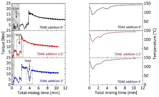 Mixing regime can result in different bound rubber development of rubber blends [46]. In Figure 1, mixing behavior of silica-filled SBR/BR blends with 5 phr TDAE in, is shown for different plasticizer addition time. Five phr oil content was chosen considering the easy handling of low plasticizer contents in mixing. Each blend was mixed for 10 min, after rubber fed to the mixing chamber which is shown as shaded areas on the graph. To investigate the plasticizer addition at 0 min, TDAE was fed to the chamber together with SBR and BR for 2 min to avoid sudden torque decreases. It is visible that mixing torque is, to a minor extent, lower compared to other blends at the first minutes of mixing and after feeding of silica at the second min. At the end of 10 min of mixing, torque is observed at the same level with other blends and dump temperature is 143 °C. For the investigation of plasticizer addition at 1.5 min, TDAE was fed to system after a short pre-mixing with silica and silica addition caused a little higher torque increase than other blends in the mixing. Dump torque and temperatures were 10 Nm and 144 °C, respectively. Addition of plasticizer at 3 min was carried out by a syringe, similar to 1.5 min addition. After the oil addition at 3 min, torque and temperature decreased slightly. Dump torque and temperatures were observed a little higher than other blends, which are 12 Nm and 145 °C, respectively.