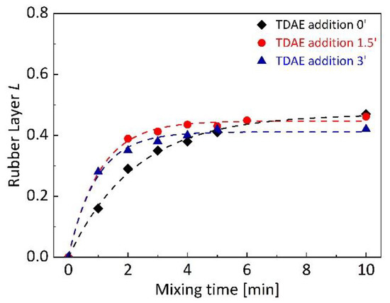 The rubber layer L in dependence on mixing time was determined for silica-filled SBR/BR binary blends with different TDAE addition time, shown in Figure 2. The main influence of plasticizer addition time was observed on rubber layer L development at earlier stages of mixing. TDAE addition at 0 min showed the slowest rubber layer L development compared to 1.5 and 3 min of oil addition time. The reason could be the low viscosity by the addition of plasticizer at the beginning of mixing, that can influence the filler dispersion [47] and can cause poor dispersion at short time of mixing. Retarded reduction of agglomerates because of the small shear forces during mixing may delay the completion of the rubber layer formation. The fastest rubber layer development was observed for TDAE addition at 1.5 min with silica. On the other hand, any significant difference could not be seen in the plateau values () of binary blends, which are around 0.4 for each. Since represents the maximum achievable rubber layer in the blend, it can be claimed that approximately 10 min of mixing is required in this mixer with the described mixing parameters to achieve maximum rubber–filler interactions for the SBR/BR blends without depending on the oil addition time.