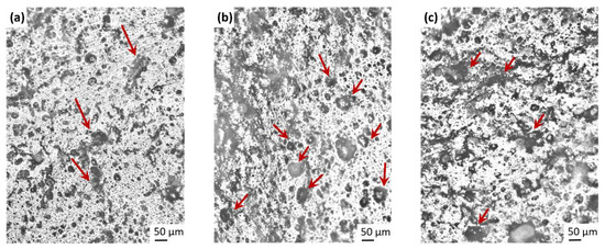 Microscopy analysis of macro-structures and micro-structures of fillers can be utilized to examine rubber–filler interactions, beside filler–filler interactions. In high level of silica loadings, qualitative analysis of micro-dispersion and micro-structures are difficult because of the three-dimensional superposition of the aggregates inside agglomerates [52]. In addition, the presence of oils and various components typically used in tire technology, make the analysis more complex. Macro-scale investigations of uncured SBR/BR blends were carried out by optical light microscopy to observe silica dispersion and distribution, shown in Figure 5. Silica aggregates and agglomerates with different sizes can be seen as dark regions in SBR/BR matrix, in Figure 5a. The spherical structures up to 40 µm diameter which are marked with arrows, can be silica agglomerates and indicates poor dispersion. In principle, the big silica agglomerates are destroyed under high shear forces during mixing and the probability of presence of flocculated silica particles after long mixing time like 10 min is low, however the silica can re-agglomerate after mixing. Considering to the high tendency of re-agglomeration of silica after mixing [9], analyses can be influenced by the re-agglomeration during storage time. The presence of 5 phr TDAE in the binary blend caused a noticeable increase of the dark regions and the amount of spherical structures in the images, seen in Figure 5b. The enhancement of dark regions is observed much higher for 20 phr plasticizer added blend, beside blurred dark regions shown by arrows in Figure 5c. It is hard to distinguish the regions belonging to silica agglomerates and TDAE oil droplets in light microscopy images, since both silica agglomerates and TDAE droplets appear dark under light microscopy. The presence of high amount of oil can shield the silica aggregates as well and it is not possible to make a statement on filler flocculation. These results demonstrate the need for other characterization methods for the investigation of filler–filler interactions. For this purpose, Payne effect was investigated for the unvulcanized binary blends.