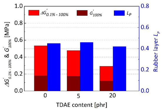 Difference between storage shear modulus at 0.1% and 100% strain amplitudes (ΔG′0.1%–100%), the storage shear modulus at 100% strain amplitude (G′100%) and the plateau value of rubber layer relation of uncured silica-filled SBR/BR blends depending on TDAE content.