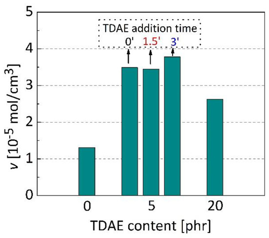 Crosslink density () of silica-filled SBR/BR vulcanizates with varying TDAE content and addition time, as calculated using the Flory–Rehner equation.
