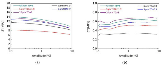 Storage tensile modulus (E′) (a); and loss tensile modulus (E″) (b) of silica-filled SBR/BR vulcanizates depending on TDAE content and addition time. The analyses were carried out with 10 Hz frequency and at 60 °C.
