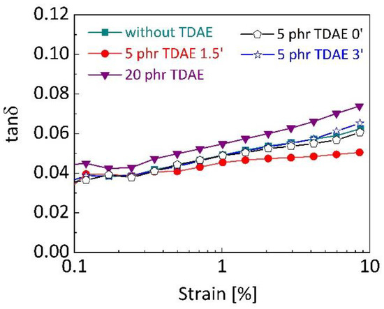 The loss factor tan δ at 60 °C was calculated as the ratio of loss modulus (E″) to storage modulus (E′). It is known that lower values of tan δ indicate lower hysteresis, which results in less energy dissipation [53]. Figure 9 shows the tan δ at 60 °C values of the silica-filled SBR/BR vulcanizates depending on TDAE content and addition time. It can be seen that the SBR/BR blends without TDAE and with 5 phr TDAE added at 0 and 3 min of mixing, show quite close hysteresis and the value is lower than the blend with 20 phr oil content. The highest hysteresis belongs to 20 phr TDAE content due the contribution of its high E″ to tan δ, shown in Figure 8b. In addition, the interfacial slippage between rubber and filler, which is a source of energy dissipation [63] may be another reason. With the presence of high oil content in blends, the slippage of entanglements can be more and result in higher energy dissipation. On the other hand, the presence of 5 phr TDAE which was added at 1.5′ resulted in the lowest tan δ at 60 °C. This decrease in the hysteresis may be attributed to a less developed filler–filler network [53].