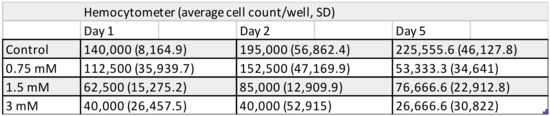Number of viable pulp cells at various time-points of the 5-day exposure to 0.75, 1.5, and 3 mM triethylene glycol dimethacrylate (TEGDMA), as measured by a hemocytometer (sample number: n = 2).