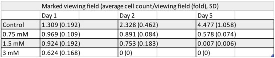 Number of viable pulp cells at various time-points of the 5-day exposure to 0.75, 1.5, and 3 mM TEGDMA, as counted in marked fields of view (sample number: n = 2).