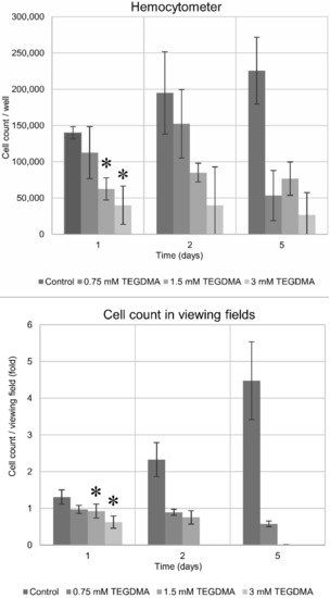Number of viable pulp cells at various time-points of the 5-day exposure to 0.75, 1.5, and 3 mM TEGDMA, as measured by a hemocytometer and counted in marked fields of view. The hemocytometer graph presents the absolute number of viable cells, while the marked fields of view graph plots the decrease in the number of viable cells as a ratio relative to the control cell number at the start of the experiment. * = significantly different from the untreated control of the first day (for the hemocytometer, P = 0.0018, P = 0.0002 at 1.5 mM and 3 mM TEGDMA concentrations, and P = 0.0293, P = 0.0004 at 1.5 mM and 3 mM TEGDMA concentrations for the viewing field data, respectively, sample number: n = 2).
