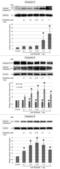 Immunoblots showing the changes in the levels of cleaved caspase-3, -8, and -9 in pulp cells after a 1-day exposure to 0.1, 0.2, 0.75, 1.5, and 3 mM TEGDMA. GAPDH or β-actin bands, obtained by reprobing the Western blot membrane, served as a loading control each time. Results of the quantitative analysis of densitometry data are illustrated below each blot (gathered by ImageJ). * = significantly different from the untreated control (in the case of the cleaved caspase-3 P = 0.0174 and P < 0.0001 at 1.5 mM and 3 mM, respectively; for the uncleaved caspase-8 P = 0.0002, P< 0.0001, P< 0.0001, and P< 0.0001 at 0.2 mM, 0.75 mM, 1.5 mM, and 3 mM, respectively; for the cleaved caspase-8 P = 0.0002, P < 0.0001, P < 0.0001, and P < 0.0001 at 0.2 mM, 0.75 mM, 1.5 mM, and 3 mM, respectively; in the case of the cleaved caspase-9 P = 0.0208, P < 0.0001, P < 0.0001, P < 0.0001, and P = 0.0035 at 0.1 mM, 0.2 mM, 0.75 mM, 1.5 mM, and 3 mM, respectively, sample number: n = 3).