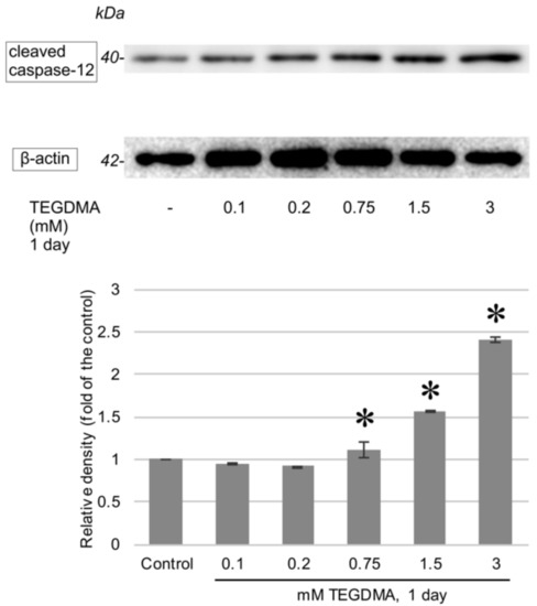 Immunoblots showing the changes in the levels of cleaved caspase-12 after a 1-day exposure to 0.1, 0.2, 0.75, 1.5, and 3 mM TEGDMA. β-actin bands, obtained by reprobing the Western blot membrane, served as a loading control each time. Results of the quantitative analysis of densitometry data are illustrated below the blot. * = significantly different from the untreated control (P = 0.0074, P < 0.0001, and P < 0.0001 at 0.75 mM, 1.5 mM, and 3 mM, respectively, sample number: n = 3).