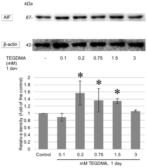 Western blots representing the alterations in Apoptosis-Inducing Factor (AIF) concentrations after a 1-day exposure to 0.1, 0.2, 0.75, 1.5, and 3 mM TEGDMA. β-actin is presented as a means of loading control. Results of the quantitative analysis of densitometry data are illustrated below the blot. * = significantly different from the untreated control (P < 0.0001, P = 0.0074, and P = 0.0158 at 0.2 mM, 0.75 mM, and 1.5 mM respectively, sample number: n = 3).