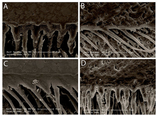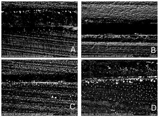 Twelve teeth (n = 3) were used for evaluating nanoleakage amongst the resin–dentin interface specimens of different groups. After performing the bonding procedure as mentioned earlier, the teeth were kept in artificial saliva for 24 h for immediate evaluation. Nail varnish was applied 1.0 mm away from the bonded interface covering the entire surface except the resin–dentin bonded area. The specimens were then immersed in 50 wt % of ammonical silver nitrate (pH = 9.5) solution for 24 h. After that, the specimens were rinsed with deionized water and placed in a photo developing solution (TMAX Liquid Film Developer; Kodak, Warwick, RI 02887, England) for 8 h under fluorescent light. Once the specimens were removed from the photo developing solution, the specimens were again washed using deionized water, and wet polished with diamond pastes (3 µm; Buehler Ltd, Lake Bluff, IL, USA) using a polishing cloth. The specimens were then ultrasonically cleaned for 15 min, dried for 24 h, mounted on stubs, and coated with carbon. Resin–dentin interface was evaluated using SEM at 15 kV operated in a back-scattered mode. Around twenty images were taken from each group at 500× magnification, and silver deposition was assessed by two observers. Nanoleakage silver uptake was evaluated using the score devised by Saboia et al.: 0: no nanoleakage; 1: <25% nanoleakage; 2: 25 ≤ 50% nanoleakage; 3: 50 ≤ 75% nanoleakage; and 4: >75% nanoleakage [46].