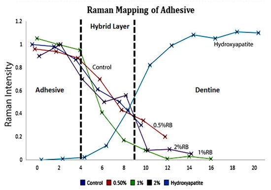 Based on the findings of this experiment, 1% RB adhesive specimens displayed higher amounts of resin penetration in comparison to the control, 0.5% and 2% modified adhesive specimens, which subsequently indicated a higher polymerization in decalcified dentin. Consequently, these results might suggest that higher penetration values (1%) activate RB and the photo-initiator simultaneously inside the adhesive, justifying and explaining the adequate depth of cure. Accordingly, the third null hypothesis can be rejected since the incorporation of ribose affected the penetration of resin inside the modified adhesive. A specific Raman peak at 1450 cm−1 is linked to the C-H band presented in most monomers and is representative for the adhesive penetration inside dentin specimens [60].