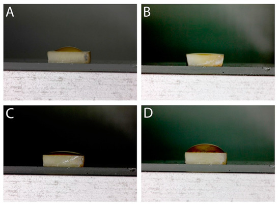 Representative images of contact angle of different adhesives; The adhesive drop is shown in (A) control; (B) 0.5% RB; (C) 1% RB and (D) 2% RB. All images captured were taken 5 min after their placement on the dentin surface. The placement of the adhesive quantifies the intrinsic aptitude of the adhesive liquid to spread on a flat, undeformable, and homogeneous solid dentin surface.