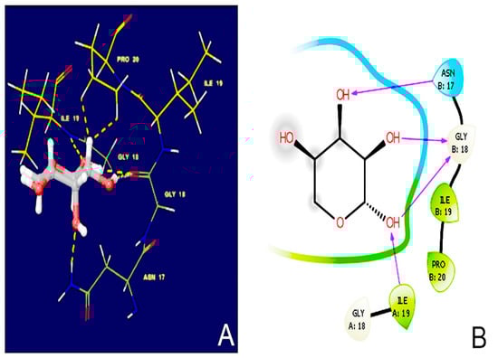 D-ribose binds to collagen (PDB ID: 6A0C) through: Hydrogen bonding interactions with asparagine (B17), glycine (B18) and isoleucine (B19); and Hydrophobic interactions with isoleucine (A19) and proline (B20). The docking score is accurately calculated as −4.384 Kcal/mole. The binding pose (3D and 2D), along with the key amino acid that participated in the binding process of D-ribose, are shown in Figure 4.