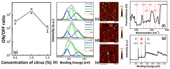 (a) The ON/OFF ratio as a function of the citrus concentration. (b) XPS C 1s spectra of the citrus thin film: C0.5 (bottom), C1 (middle), and C1.5 (top). Tapping mode 2D and 3D AFM topography images of (c) C0.5, (d) C1, and (e) C1.5 thin films. (f) FTIR analysis, and (g) XPS full spectrum analysis of the C1 thin film.