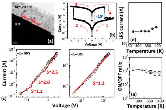 (a) TEM cross-section micrographs and (b) the typical current–voltage (I–V) characteristics of the Al/C1/indium tin oxide (ITO) structure. The bias sweep sequence is indicated by the arrows. (c) Double logarithmic plots of the high resistance state (HRS) (left) and low resistance state (LRS) (right) of the C1 memory device. (d) Temperature dependence of the LRS current of the C1 memory device. (e) The ON/OFF ratio as a function of the temperature from 273 to 393 K.