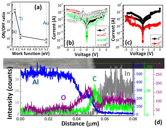 Figure 4d exhibits the intensities for Al, C, O, and In elements as a function of distance. Al was also detected in the C1 thin film. The Al concentration throughout the entire C1 thin film decreased as the distance increased, indicating that Al diffused into the C1 thin film. The AlOx layer between the Al electrode and the C1 thin film was detected. According to the line-scan profile of the C1 memory device, the AlOx at the Al/C1 interface consisted mostly of Al and O. The formation of the AlOx layer enabled the enhancement of the ON/OFF ratio of the C1 memory device. A good ON/OFF ratio is greatly needed for practical applications of resistive memory. These results thus support the strong role of the top electrode (TE) materials in dictating the switching and stability of resistive memory devices.