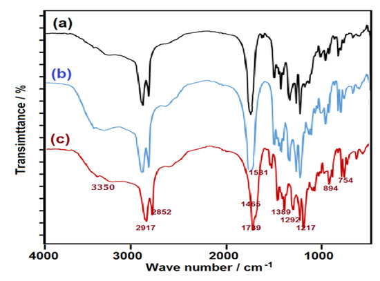 FTIR spectra of PES, WO3-PES NC, and ZnO-PES NC are shown in Figure 2. From the obtained spectra patterns, soft broad absorption peaks for OH groups manifested at 3350 cm−1. Two common symmetric stretching bands for CH– and CH= were revealed at 2852 and 2917 cm−1. Associated with ester chain formation, strong and sharp spectra were present at 1739 cm−1. Moderate spectra are shown at 1465 cm−1 due to the methylene group. Functional OH bending appeared as a medium absorption at 1389 cm−1. Two bands at 1292 and 1217 cm−1 were due to C–O of ester. C=C bending of CH= was exposed as two peaks at 894 and 754 cm−1. Owing to the low content of nano-sized oxides in PES, there are no considerable distinctions among the diagrams in which the spectrometric techniques are mainly employed to detect the hydrocarbon components [54].