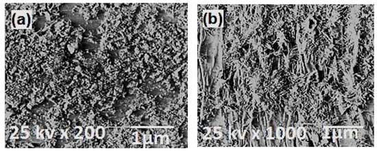 The surface morphology of metal oxide nanoparticles was characterized using the SEM technique. Before the discussion, metal oxides were found to be granulated particles. The agglomeration performance is mostly similar to all metal oxide particles prepared at relatively low temperatures [56]. With the elevating temperatures, the highly agglomerated crystalline domains were found to have fused spherical-shaped nanoparticles as shown in Figure 4. In the case of nanoparticles-based polymer (WO3-PES NC and ZnO-PES NC), SEM images (Figure 5) were found to have condensed porous shape for WO3-PES NC (Figure 5a) and diverged rode shape for ZnO-PES NC (Figure 5b).