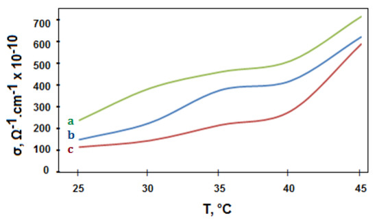In general, the electrical conductivity of the polymeric composites can be promoted by adding a conductive nanomaterial into the polymer phase. The enhancement performance is owing to the formation of a permanent conductive network along with the polymer structure. The electrical conductivity values of polymer materials containing conductive nanofillers depend on nanophase content, dispersion area, temperature, and the particle size of the nanocomposites [57]. The electrical conductivity of PES, WO3-PES NC, and ZnO-PES NC is displayed in Figure 7. From the graphs, conductivity measurements progressively increased by increasing temperature. This action corresponds with the typical ionization performance of functional COOH in the polyester matrix. High conductivities are correlated to the nano solids and heat effects [58].